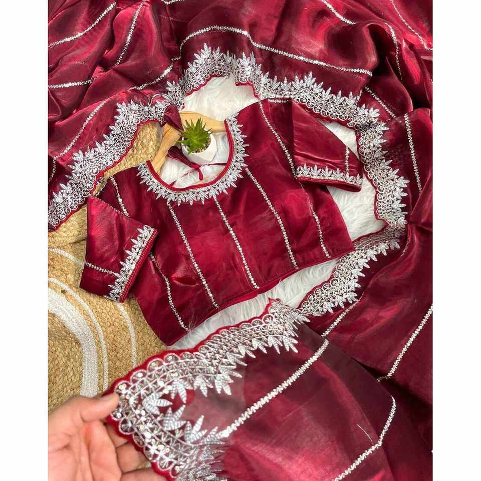 FANCY SILK SILK THREAD SEQUENCE and CUT WORK SAREE WITH STITCHED BLOUSE MAROON