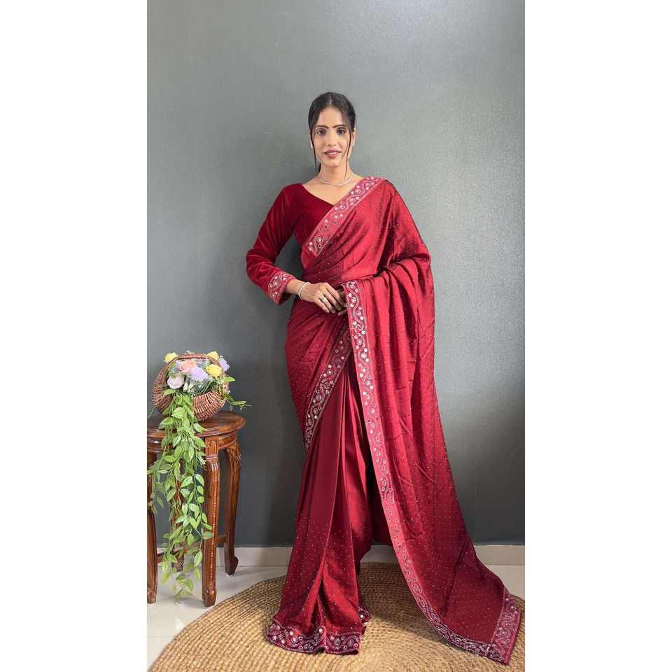 Fancy Rangoli Silk Saree With Unstitched Blouse Swarovski Mirror Velvet Lace Work Ready to Wear in Red-Casual Dresses