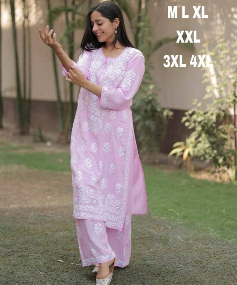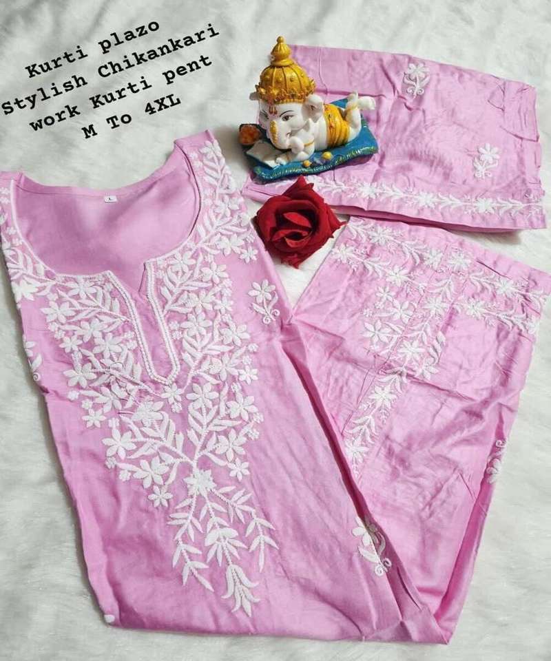 FANCY RAYON COTTON CHIKANKARI WORK KURTI PALAZZO SET FESTIVE WEAR WHOLESALE PRICE ETHNIC GARMENT PISTA COLOR KURTA SET