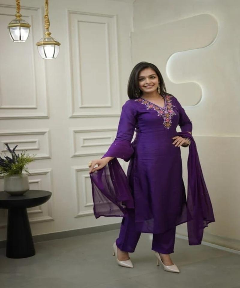 FANCY RAYON SEQUENCE EMBROIDERY WORK TOP BOTTOM WITH DUPATTA FESTIVE WEAR WHOLESALE PRICE ETHNIC GARMENT PURPLE KURTA SET