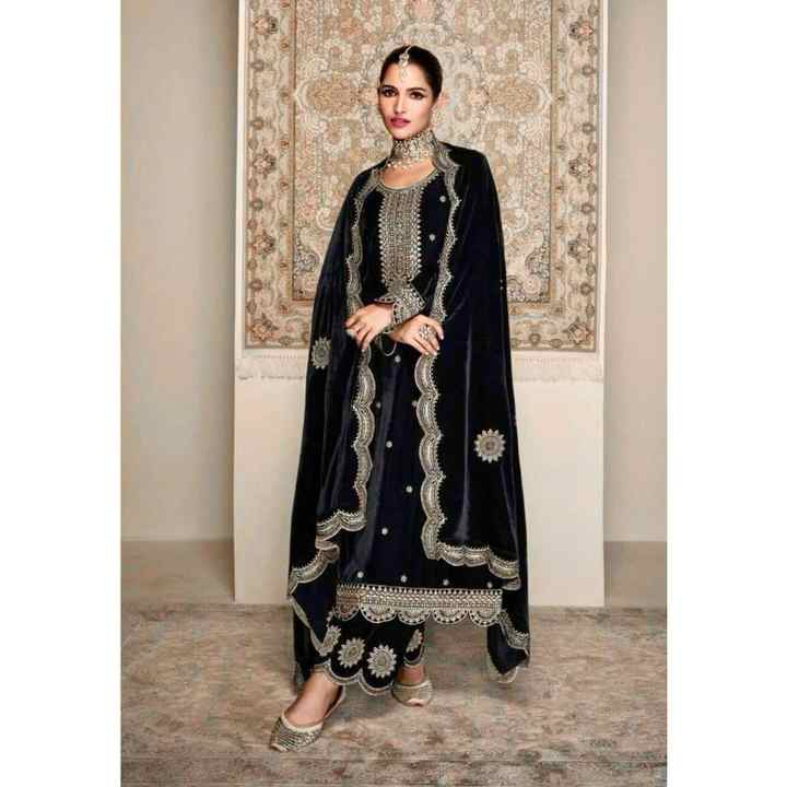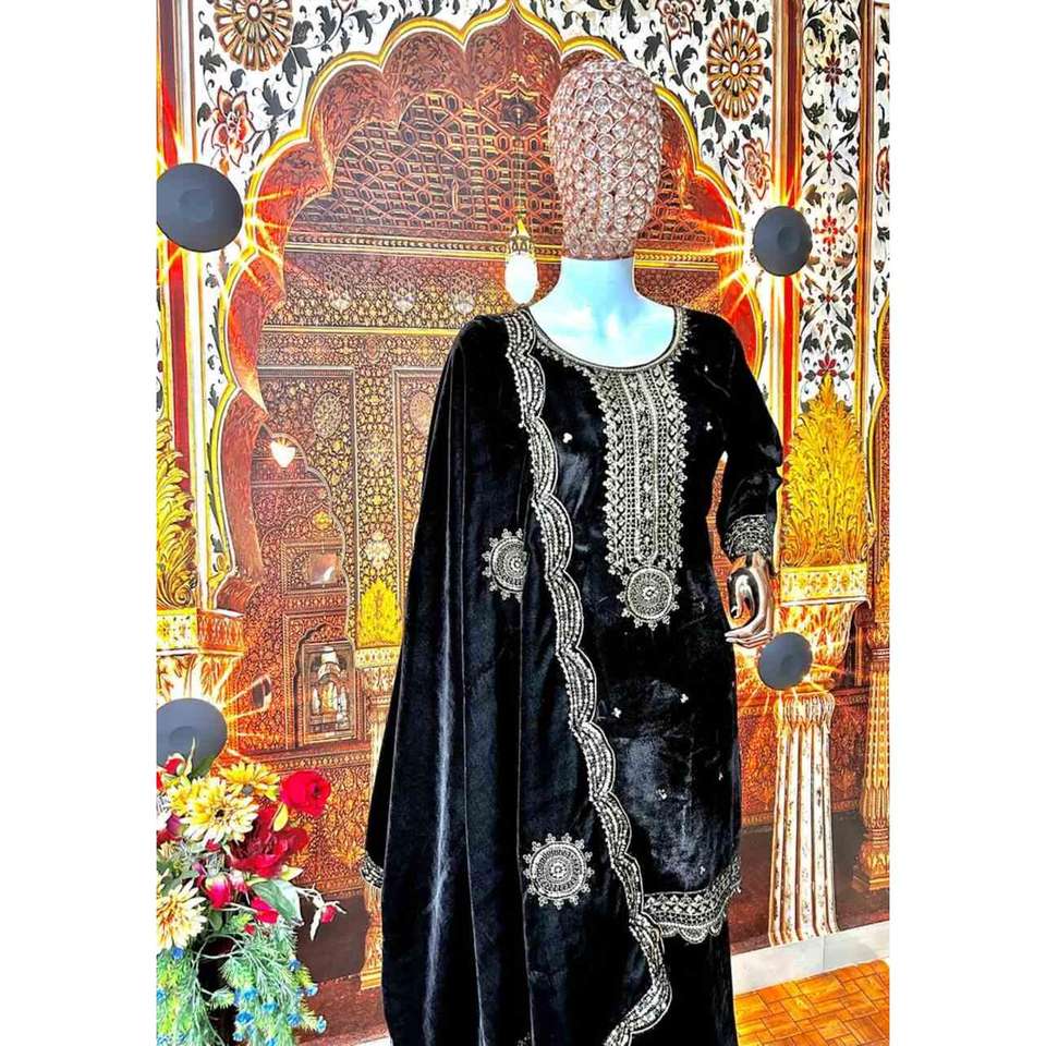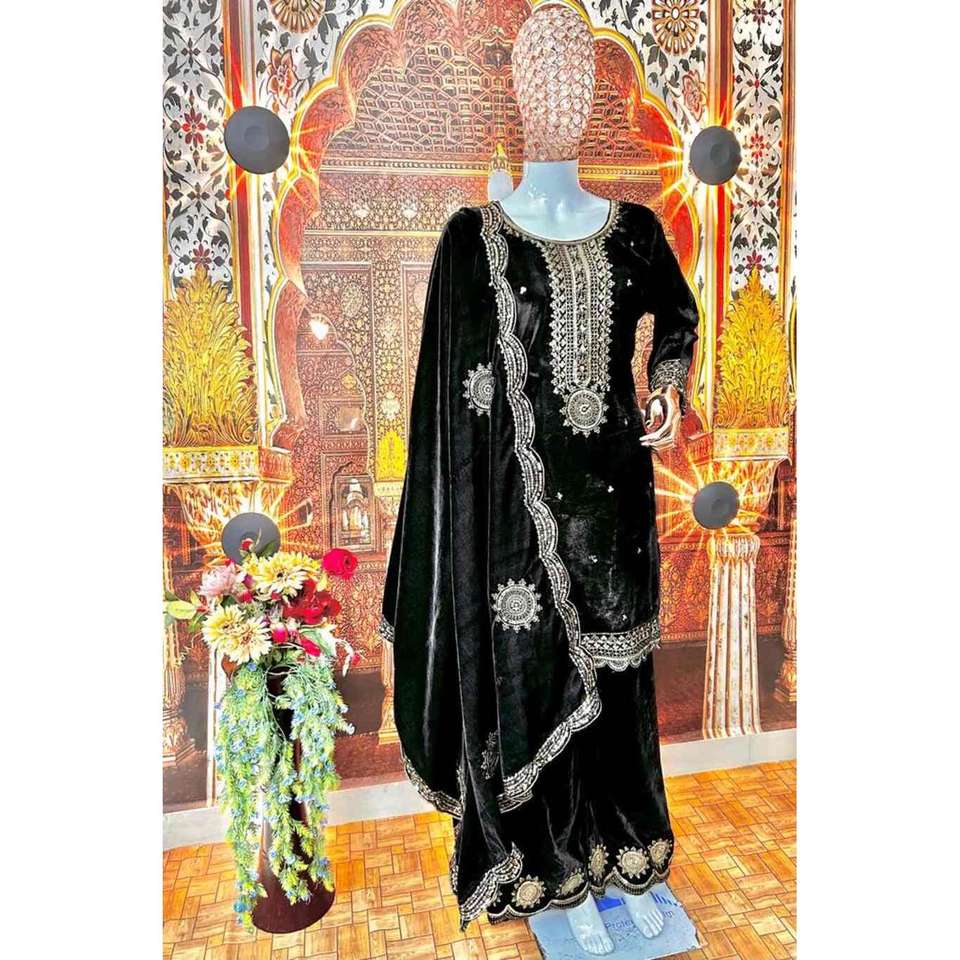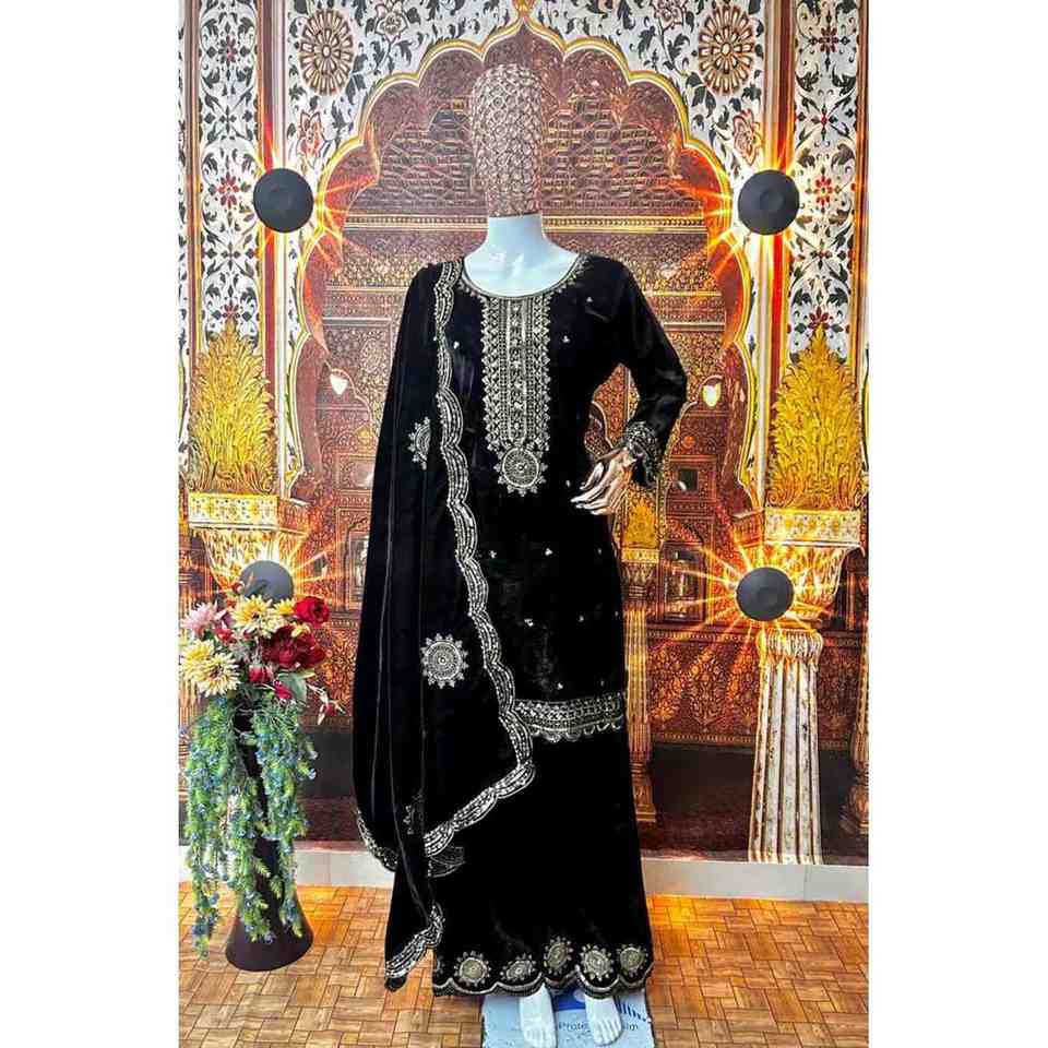 FANCY VELVET EMBROIDERY LACE WORK TOP PALAZZO WITH DUPATTA BLACK