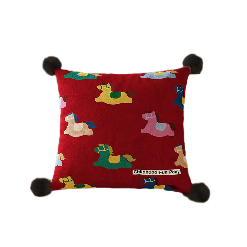 FANQ Red Festive Throw Pillow Colorful Rocking Horse Dutch Velvet Cushion Home Sofa Decor With Insert Striped Cartoon Pattern