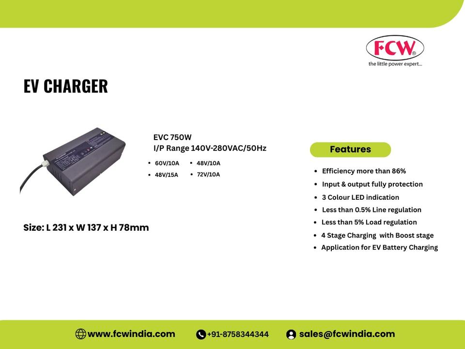 FCW 750W Electric Vehicle Battery Charger | 48V 60V 72V High Efficiency Charger | EVC750W
