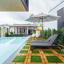 FG-VCG-AA Modern Anti-Slip Acacia Wood Grass Blend Square Tiles for Indoor/Outdoor Balcony Garden Walkway Room Decor