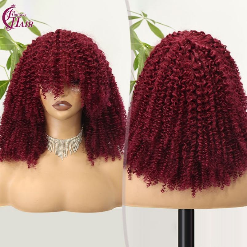 FH Wholesale Kinky Curly Bob Human Hair Wigs with Bangs T1b-4 Colored Wear and Go None Lace Front Fringe Wig for Black Women