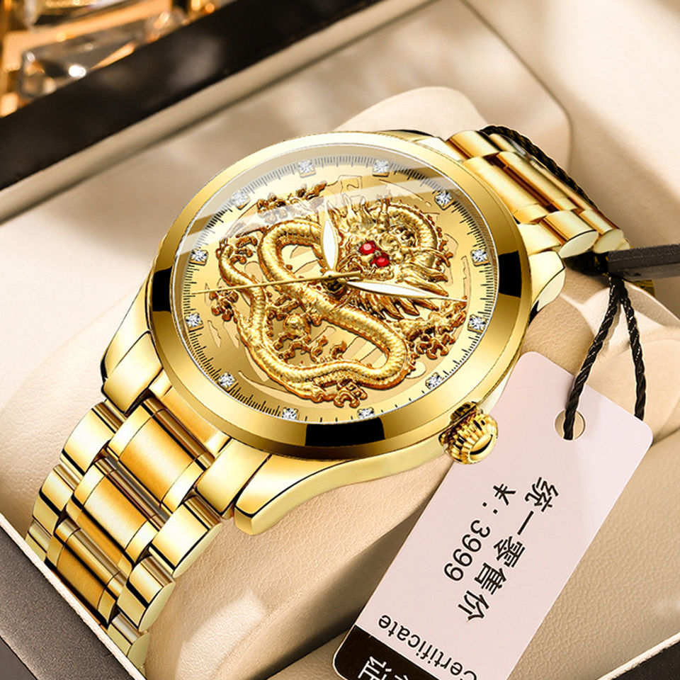 FNGEEN Men's Simple Luxury Fashion Ultra-thin Quartz Watch with Dragon Pattern Luminous Gold Stainless Steel Case Leather Strap