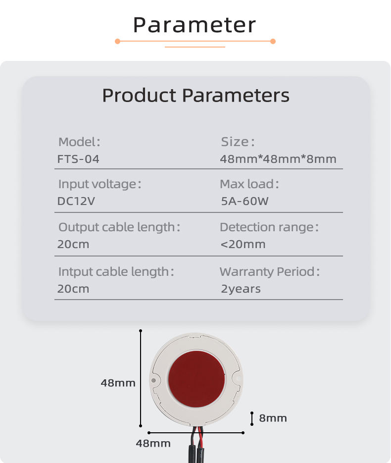 FTS-04-SM Smart Furniture Light Switch Penetrable Smart Sensor 12V 5A 60W Round Wood Panel Hidden Touch Dimming Switch