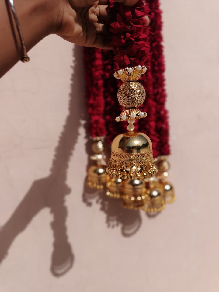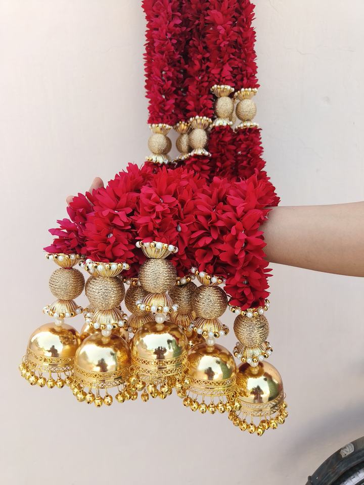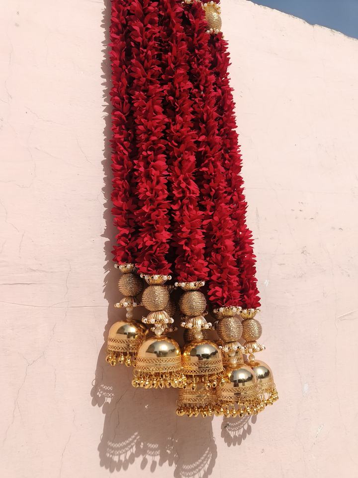 Fabric Red Jasmine Floral Door Hanging with Golden Metal Jhumka Bells Toran for Indian Wedding, Diwali, Housewarming Gift