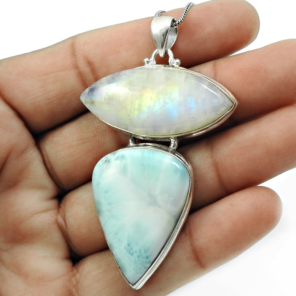 Fabulous Look 925 Sterling Silver Natural Rainbow Moonstone Larimar Gemstone Unique Design Classic Pendant Handmade Boho Jewelry