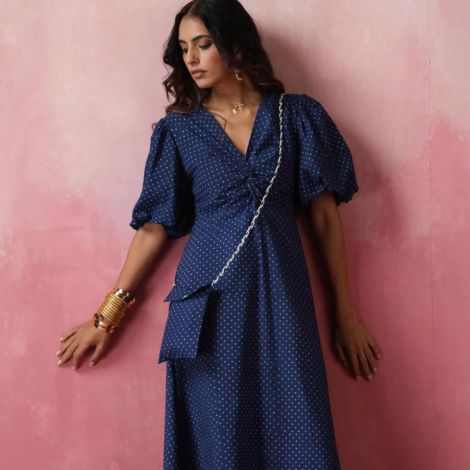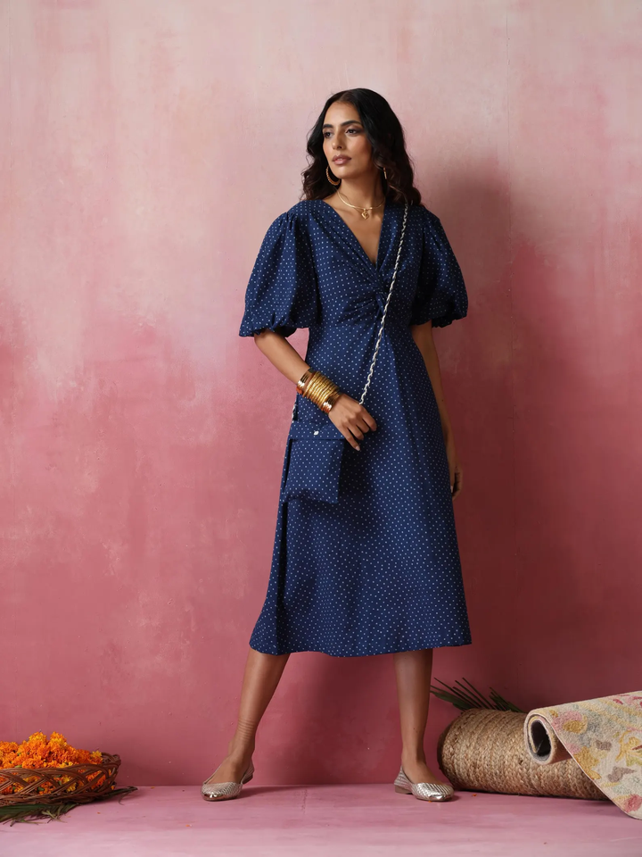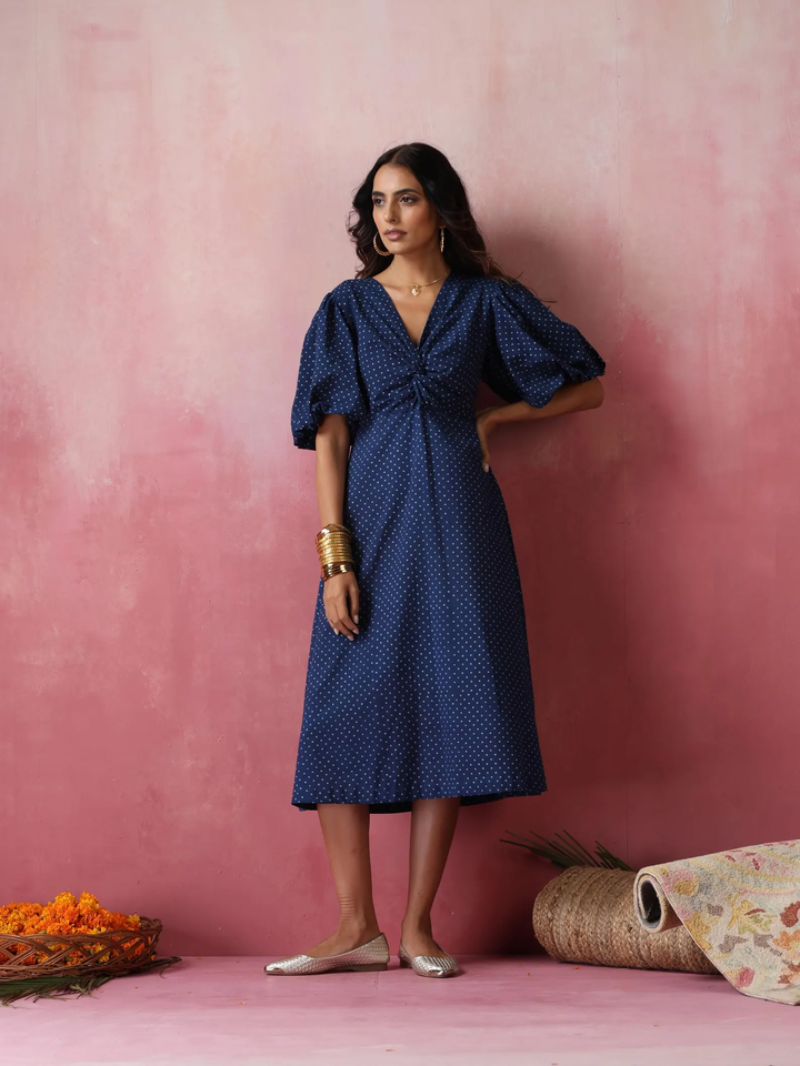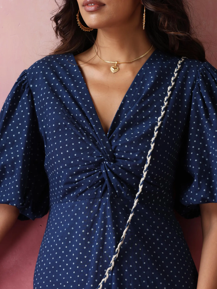 Fabulous Women's Indigo Polka Dot Cotton Midi Dress Classic Modest and Sweet Style for Spring Season