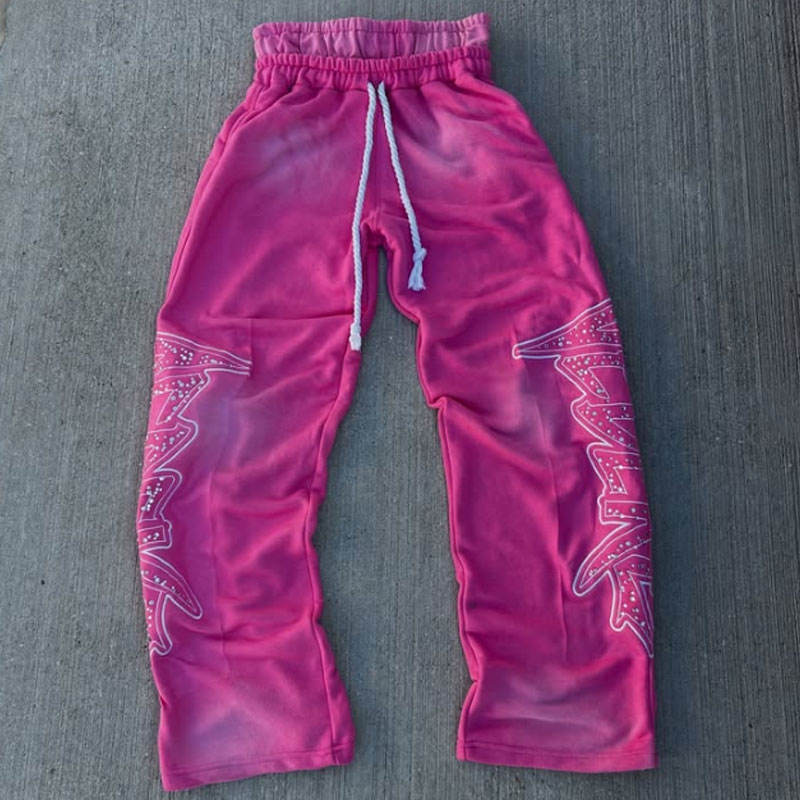 Factory Custom Double Waist Drawstring Screen Printed Rhinestone Bleach Washed Straight Woolen Jogger Lightweight Men's