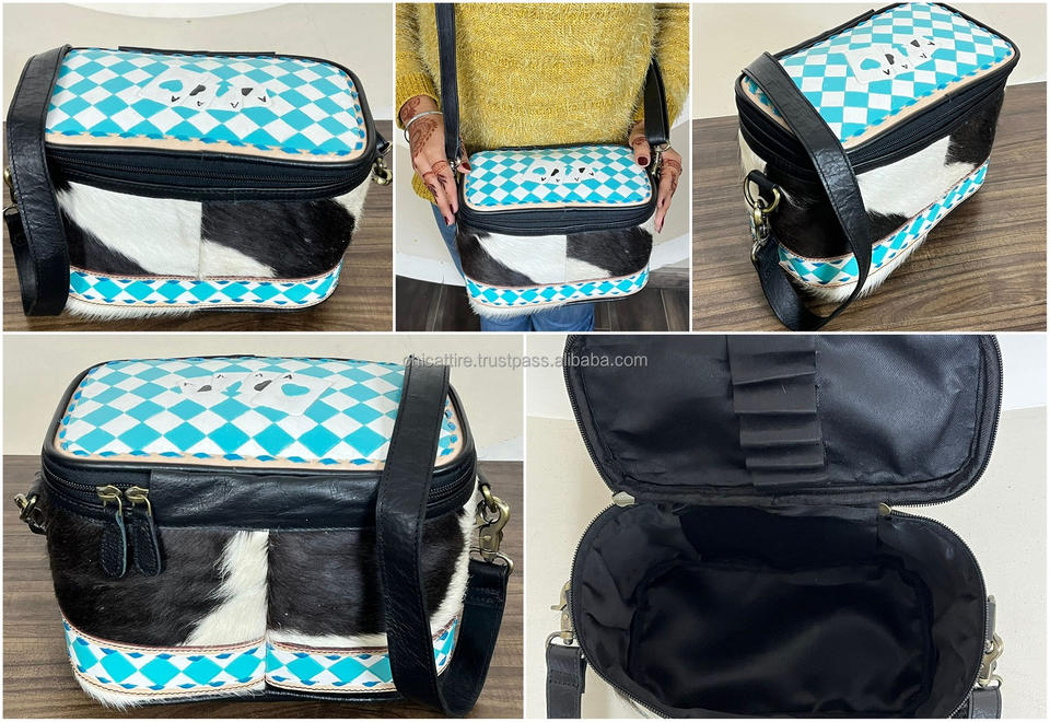 Factory Custom Hand Tooled Leather Travel Portable Makeup Bags with Shoulder Strap Checkered Beauty Cosmetic Bags Vanity Cases