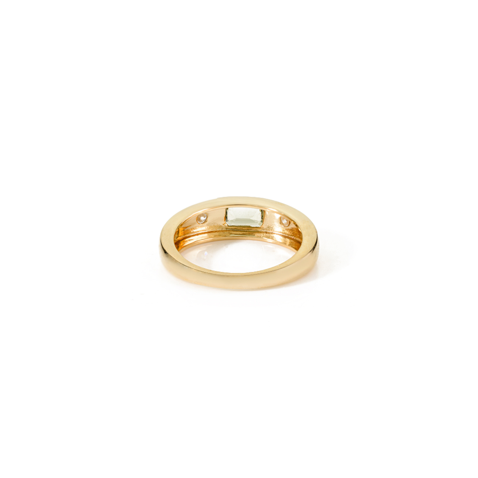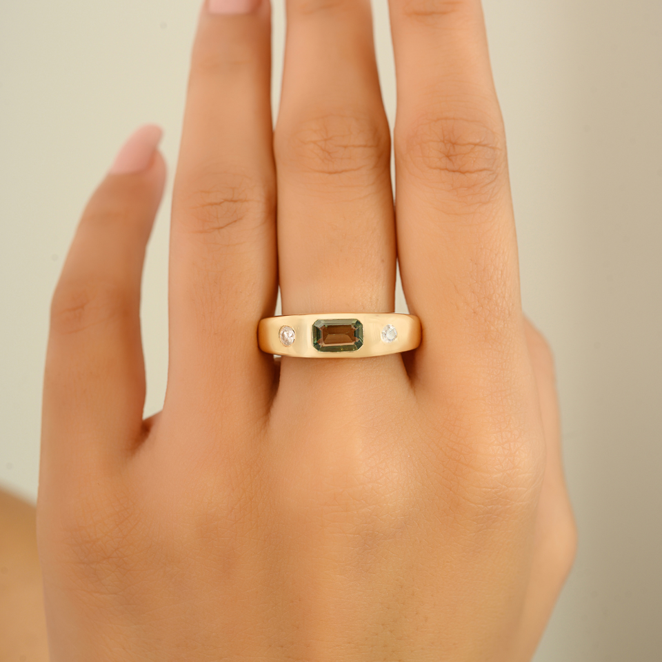 Factory Custom Hot Selling Products Green Sapphire & Diamond 14K Real Yellow Gold Gypsy Set Chunky Signet Ring Wedding Jewelry