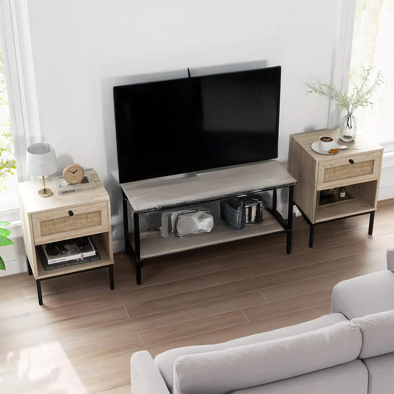 Boho-Style Rattan & Oak Nightstand with Storage Drawer & Open Shelf