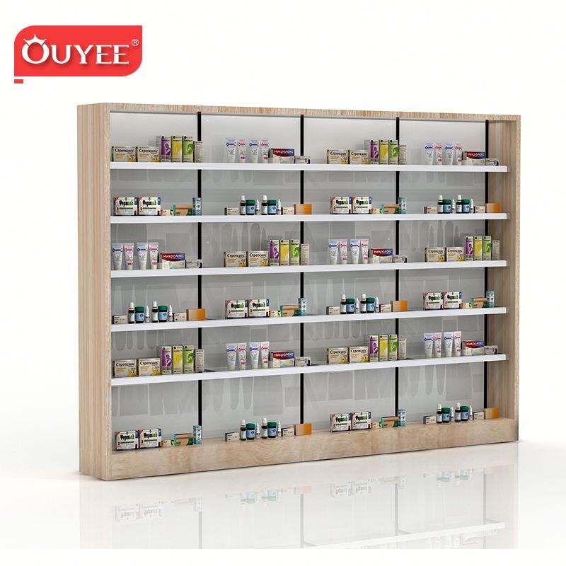 Factory Customized Light up Glass Display Case Medical Shop Interior Design Wooden Pharmacy Shelving