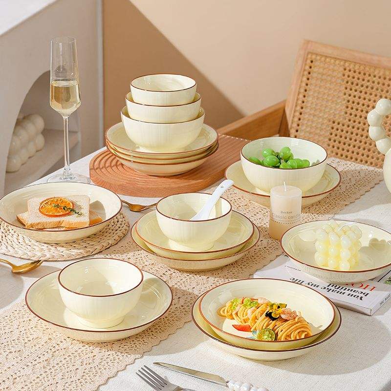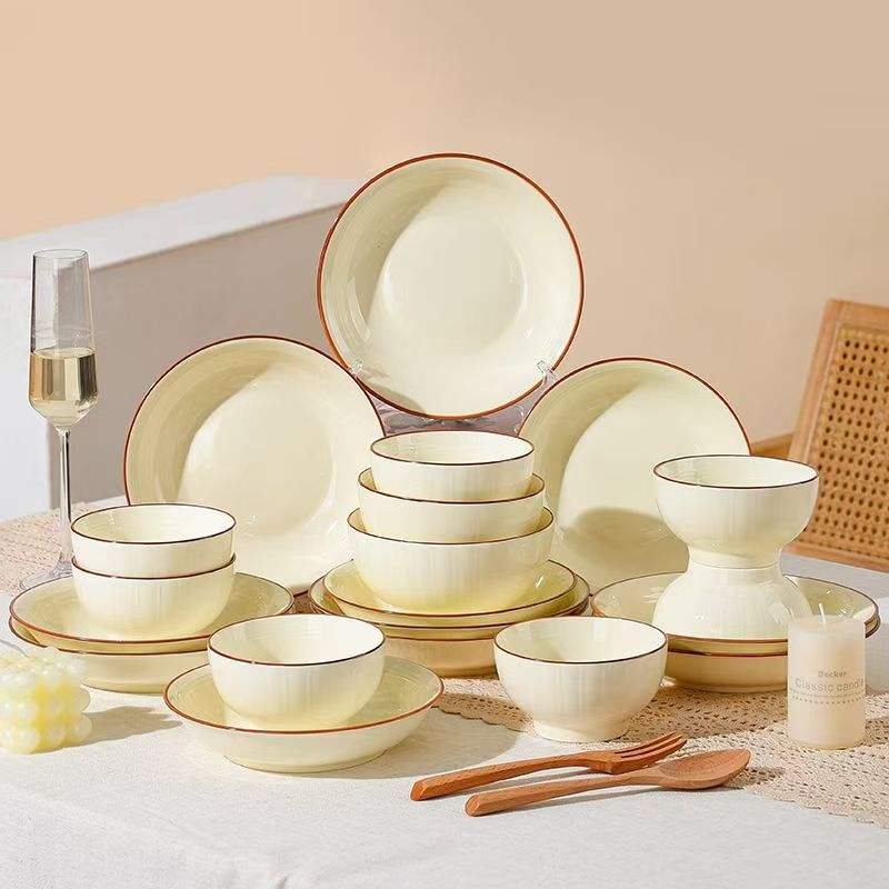 Factory Direct China Porcelain Tableware Cream-Colored Red-Rimmed Large Dinnerware Set Microwave & Dishwasher Safe Eco-Friendly