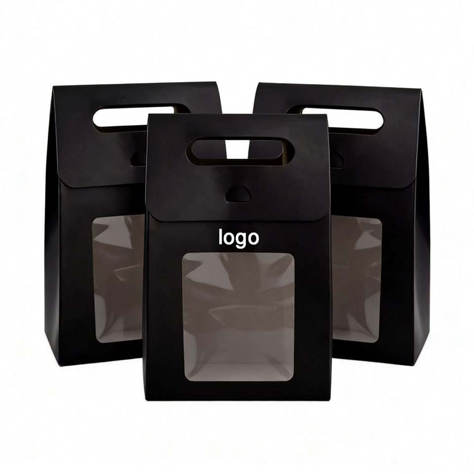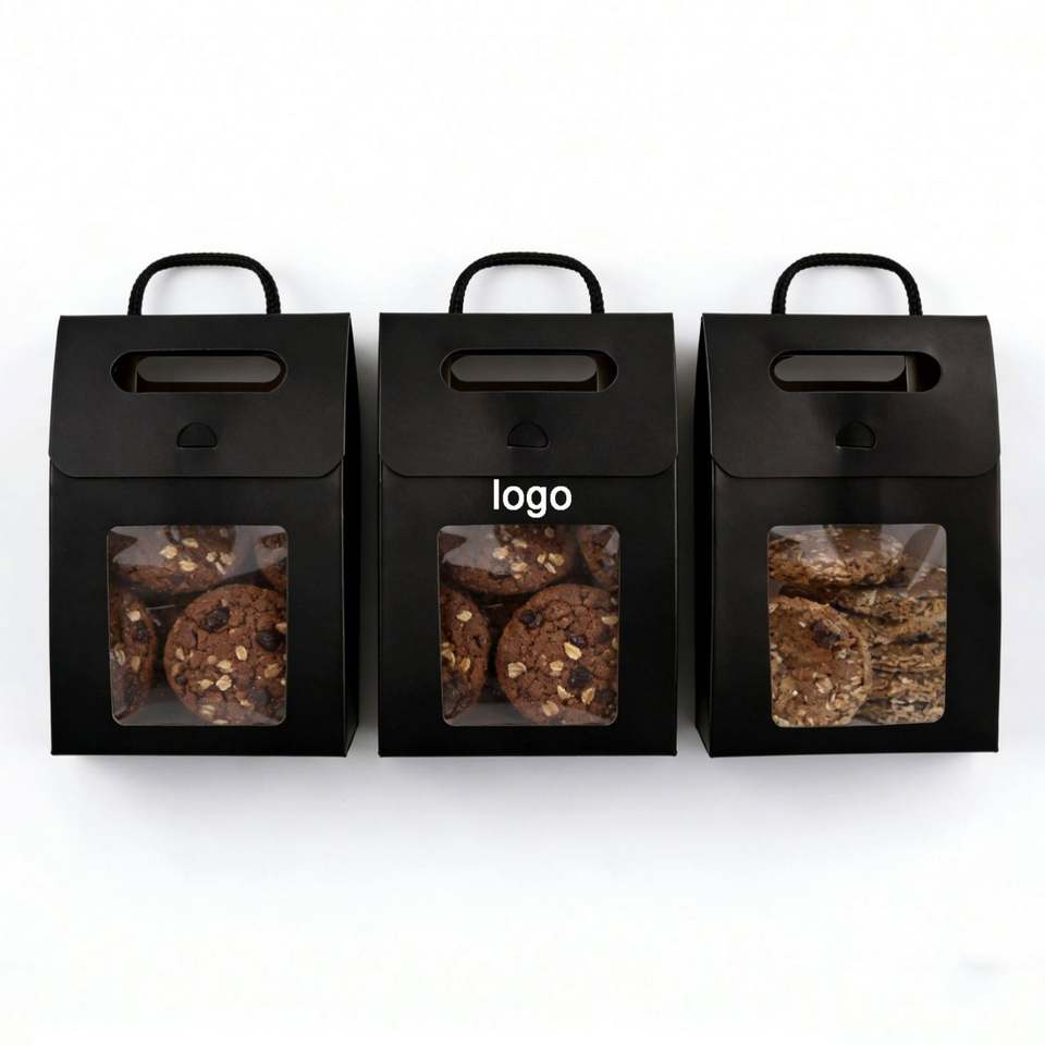 Factory Direct Customizable Black Paper Bakery Box With Window & Handle Food-Safe Ideal for Cookie & Dessert Packaging
