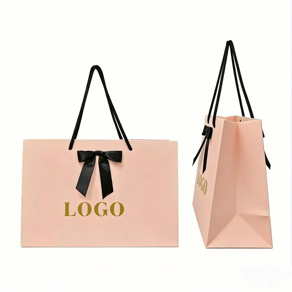 Factory Direct Customizable Free Design Blush Pink Paper Gift Bag With Bow Handle Luxury Ideal for Clothing & Gifting Packaging