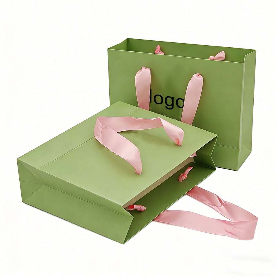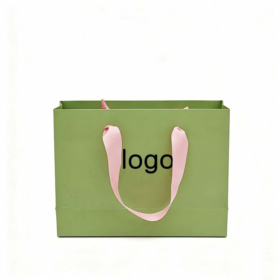 Factory Direct Customizable Free Design Eco-Friendly Biodegradable Sage Green Paper Shopping Bag Pink Handle Elegant Small