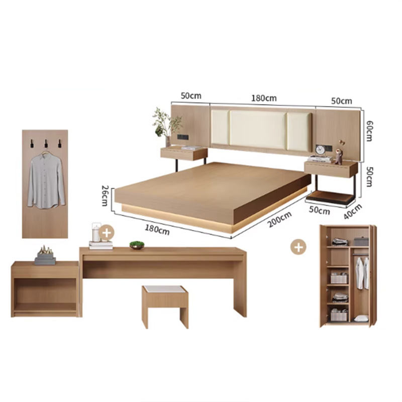 Factory Direct Low-Cost Modern Hotel Bedroom Furniture Set Complete Package Wooden Bed Frame Wardrobe Desk Nightstand Coat Rack