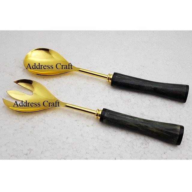 Factory Direct Selling Gold Polished Cutlery Personalised Salad Server Set With Buffalo Horn Handle Best Seller Salad Spoon Fork