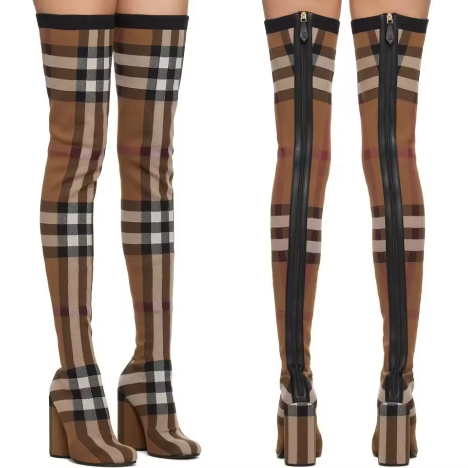 Factory Direct Selling Women's pumps Knit Plaid Check Zip Back Chunky Heeled Over-the-Knee Thigh High Stretch Winter Boots Brown