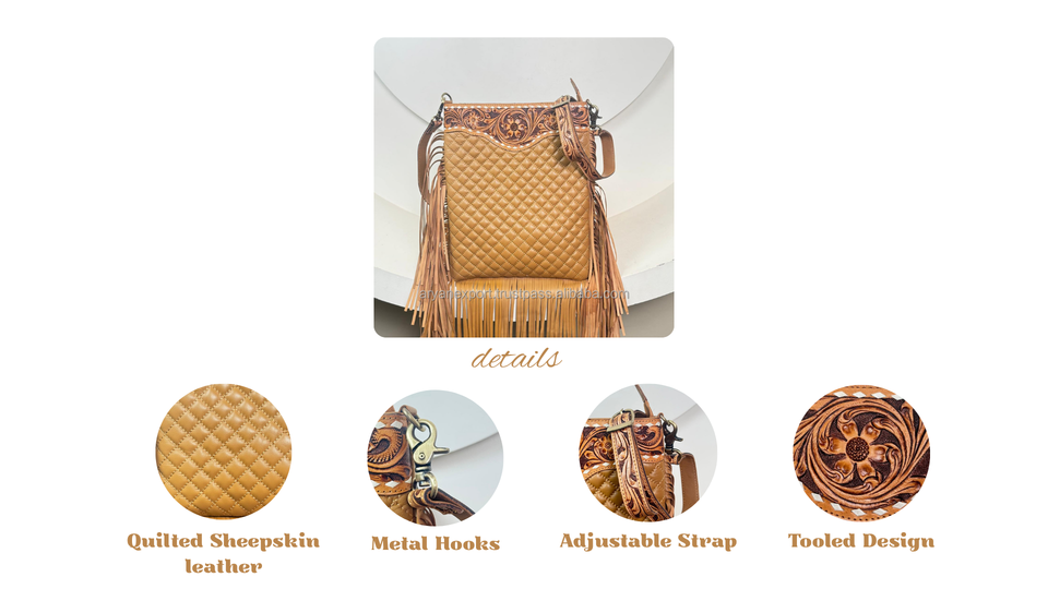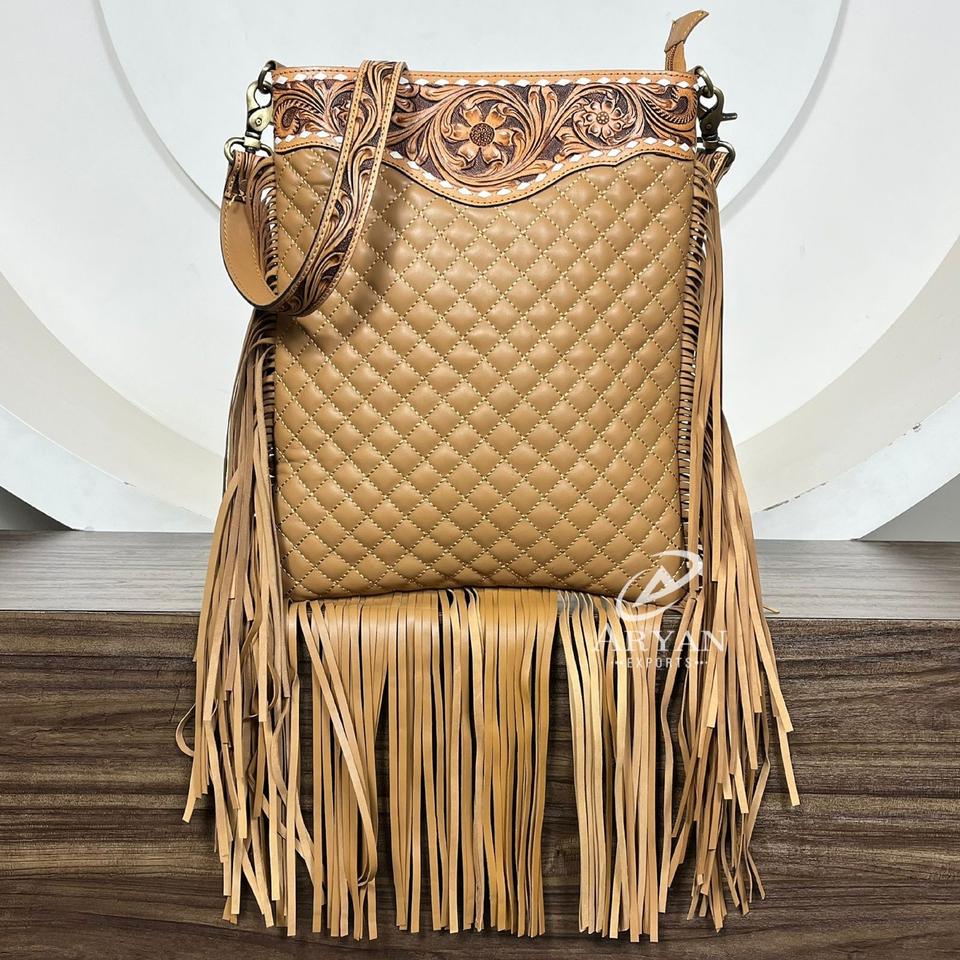 Product Name:Hand Tooled Diamond Lattice Crossbody Fringe Bag