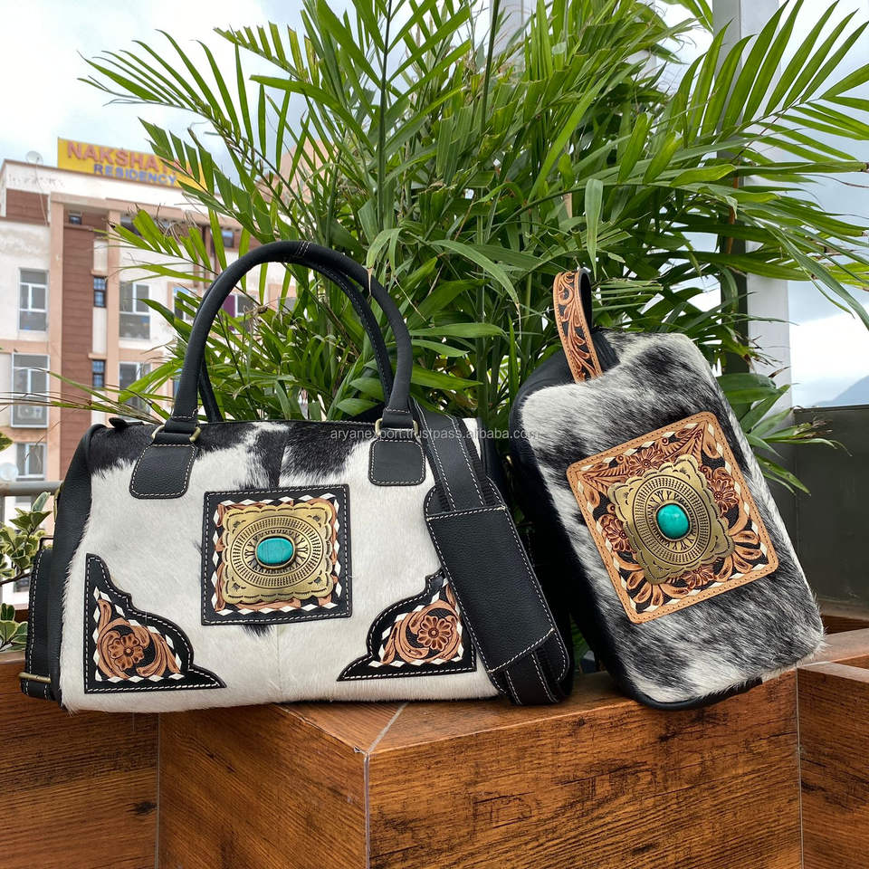 Factory Manufacturer's Unisex Genuine Leather Tooled Cowhide Leather Turquoise Stone Duffle & Toiletry Luggage 2 Piece Combo Set