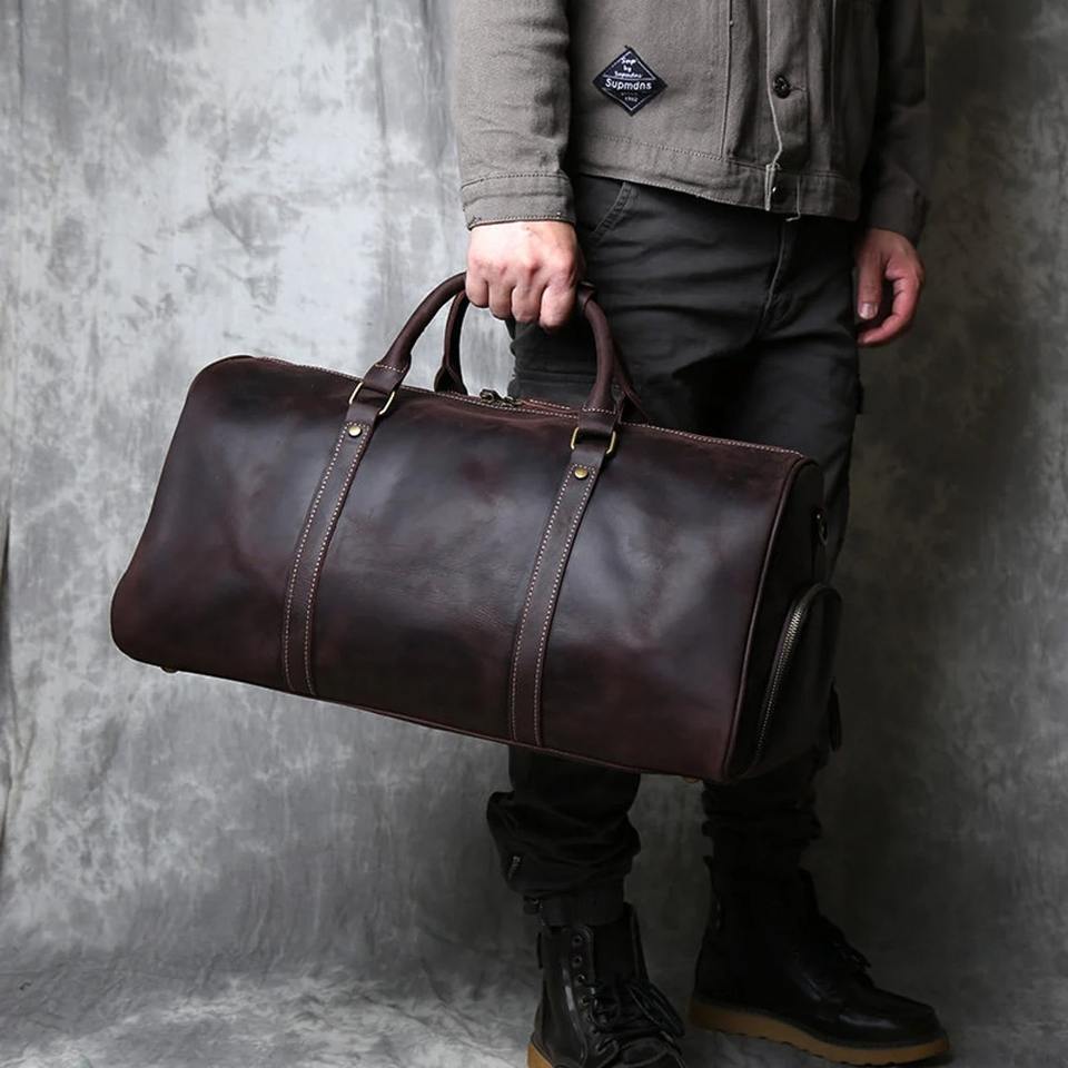 Factory Men's Large Brown Genuine Cowhide Leather Travel Duffel Bag Vintage Carry on Holdall with Zipper Closure Reusable