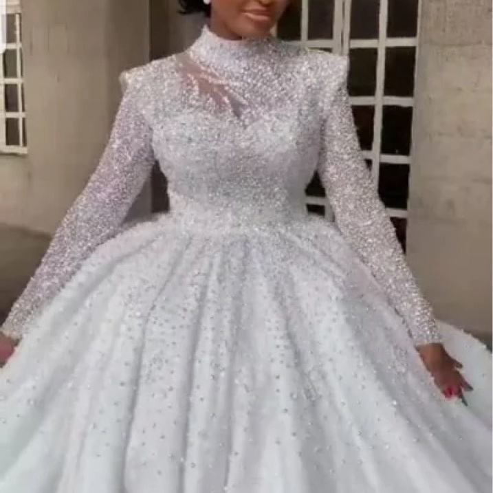 Factory Price 2025 New Heavy Industry Luxury Bridal Wedding Dress Pompadour Princess Sequin Tail Stand Collar Long Sleeve