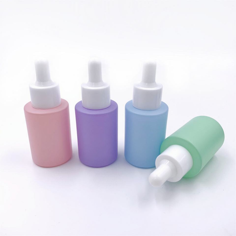 Factory Price 30ml 50ml Flat Shoulder Frosting Colorful Glass Cosmetic Essential Oil Macaron Dropper Bottle