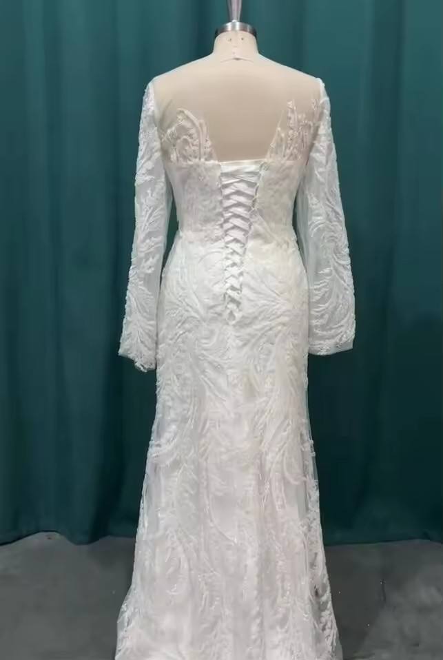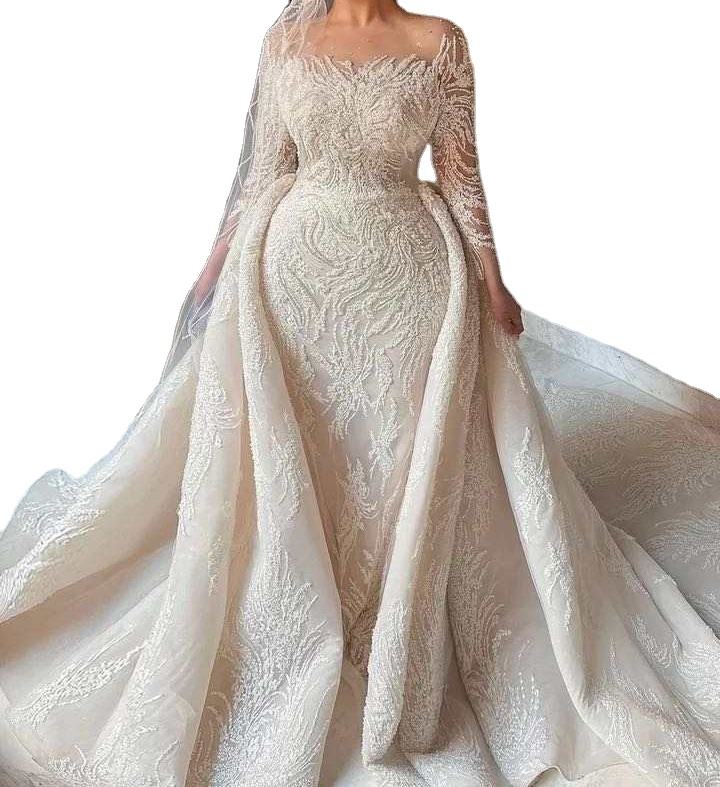 Factory Price Luxury Vintage Long Sleeve Lace Sequin Beaded Detachable Skirt Floor-Length Mermaid/Trumpet Wedding Dresses
