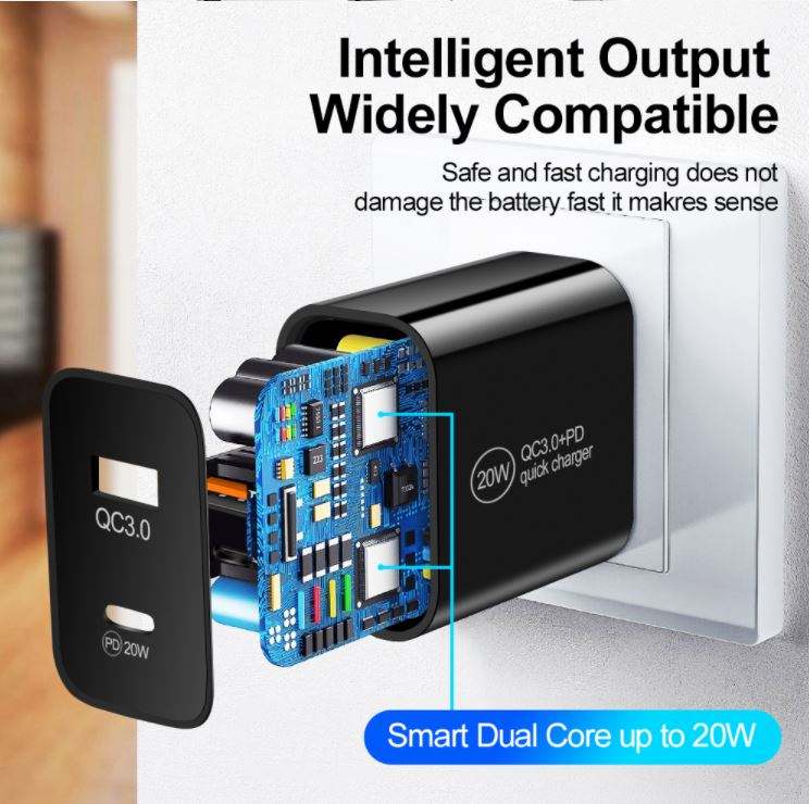Factory Price Smart Dual Port Quick Charging Adapter 20W PD QC3.0 Type C Fast Charger for Samsung EU US UK Plug