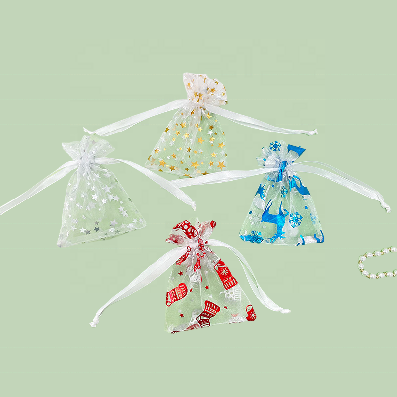 Factory Supplier Wholesale Christmas Small Gift Bag Organza Velvet Sheer Drawstring Pouch Screen Printed Customizable Size Color
