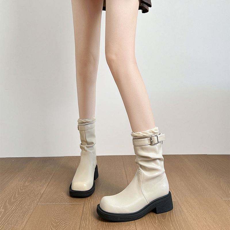 Factory Wholesale 2024 Women's Short Boot with Thick Toe Coarse Heel Middle Heel Belt Buckle Slip-On Winter Shoes