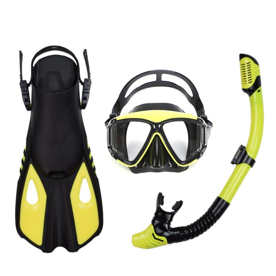 Factory Wholesale Adults Free Diving Mask Anti-Fog Anti-Leak Silicone Tempered Glass PC 3 in 1 Snorkel Set with Goggles and Fins