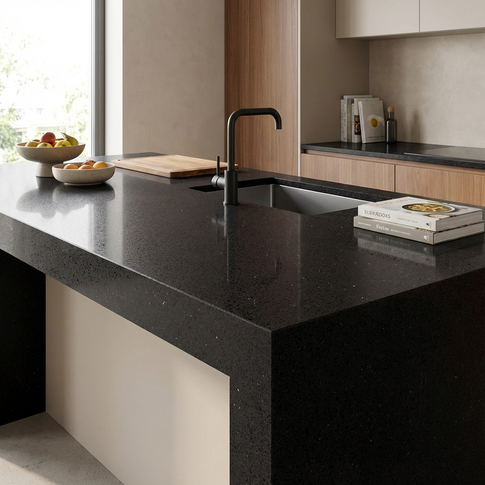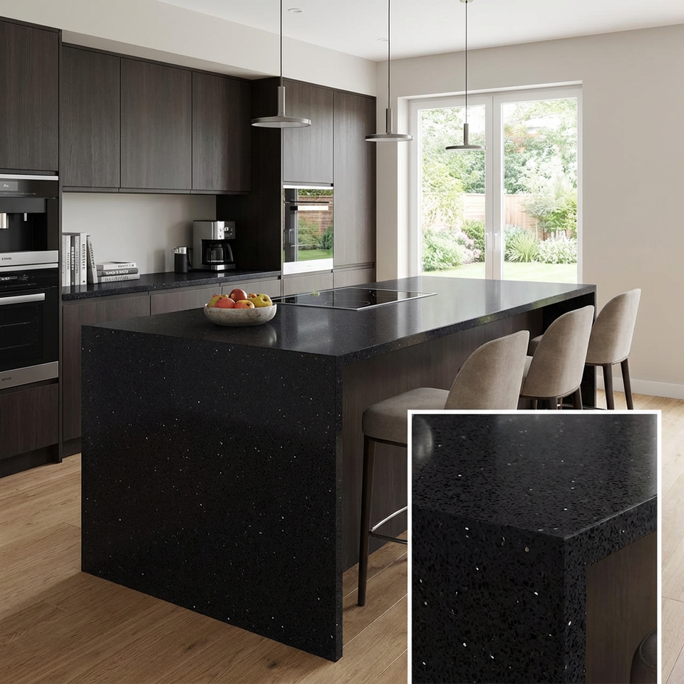 Factory Wholesale Black Galaxy Sparkle Artificial Quartz Stone Slab for Modern Kitchen Countertop Island Vanity Top