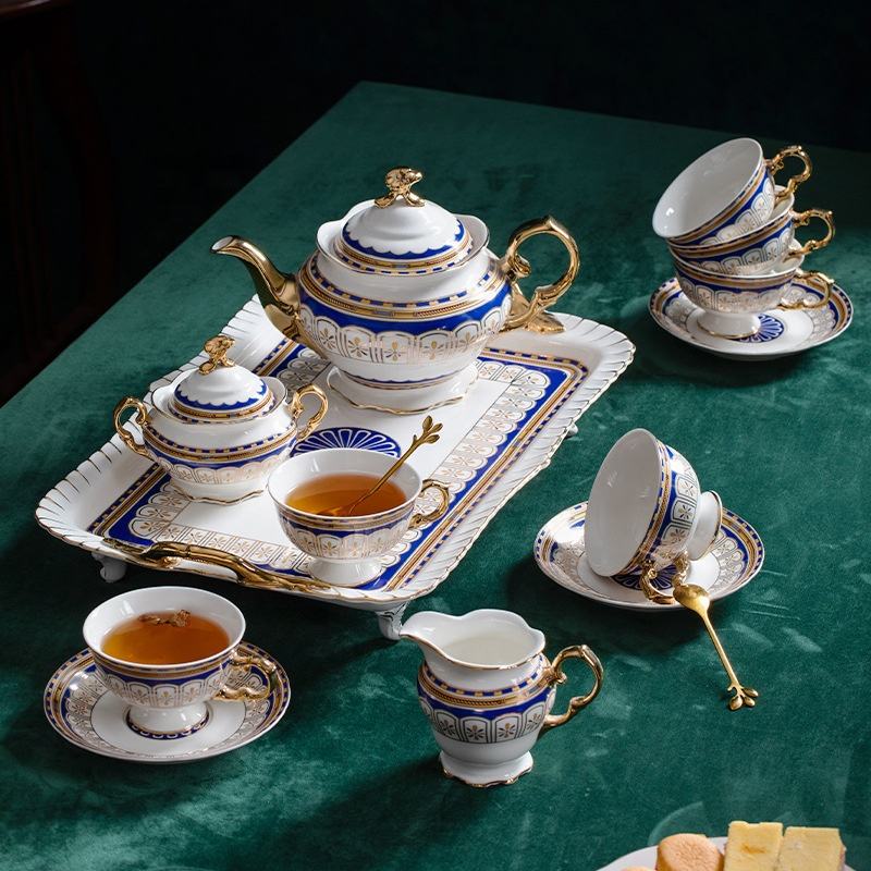 Factory Wholesale European White Blue Gilded Afternoon Tea Ceramic Coffee Set for Wedding