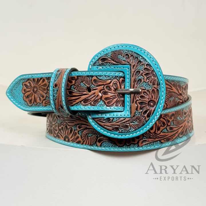Factory Wholesale Hand Tooled Leather Wide Rounded Buckles Belt for Women's Comfortable Turquoise Floral Embossed Western Belts