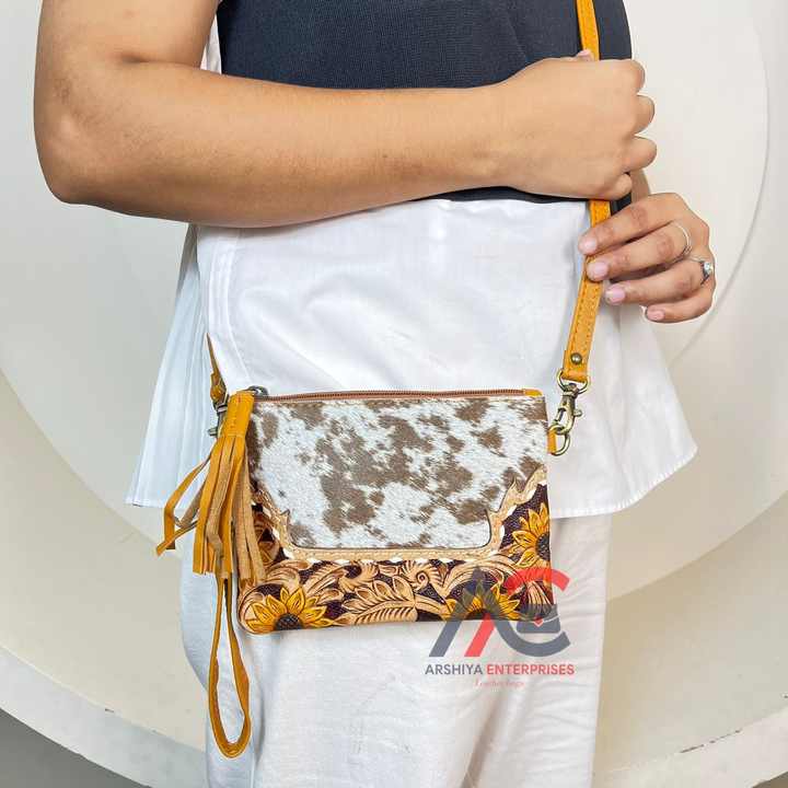 Product Name:Hand Tooled Leather Wristlet Crossbody Tassel Pouch
