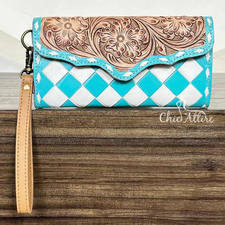 Product name:Hand Tooled Checkered Leather Wristlet Wallet