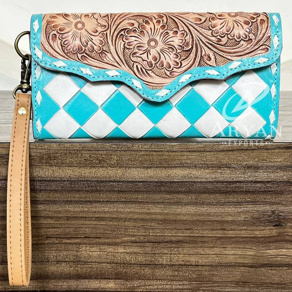 Product name:Hand Tooled Checkered Leather Wristlet Wallet