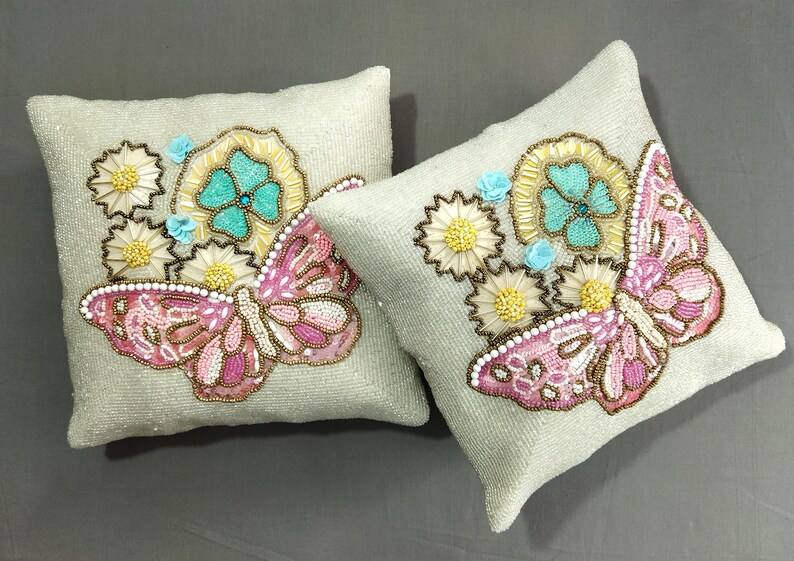 Factory Wholesale Woven Bohemian Style Beaded & Embroidered White Pink Sequined Flowers Decorative Cushion Cover for Hotel Use