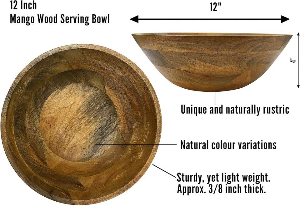 Fairwood Way Extra Large 15 Inch Rustic Mango Wood Salad Bowl with Servers Includes Wooden Salad Servers