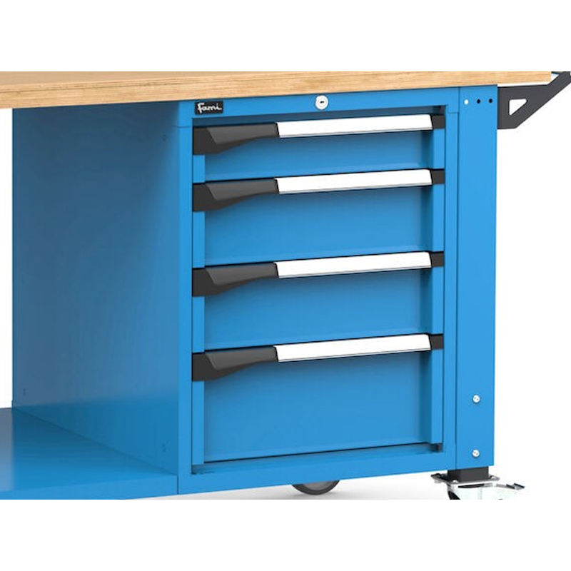 Fami Master 150cm blue adjustable workbench with wheels, 4 drawers, vice and 4 sockets
