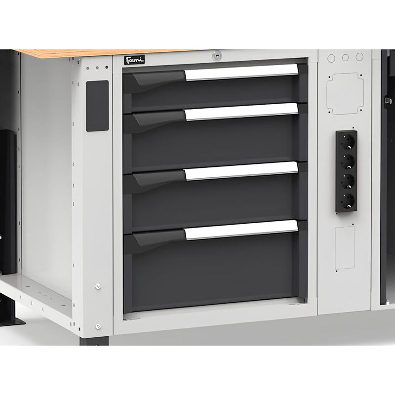 Fami Master 200cm adjustable workbench in grey with 4 drawers, cabinet, vice and 4 sockets