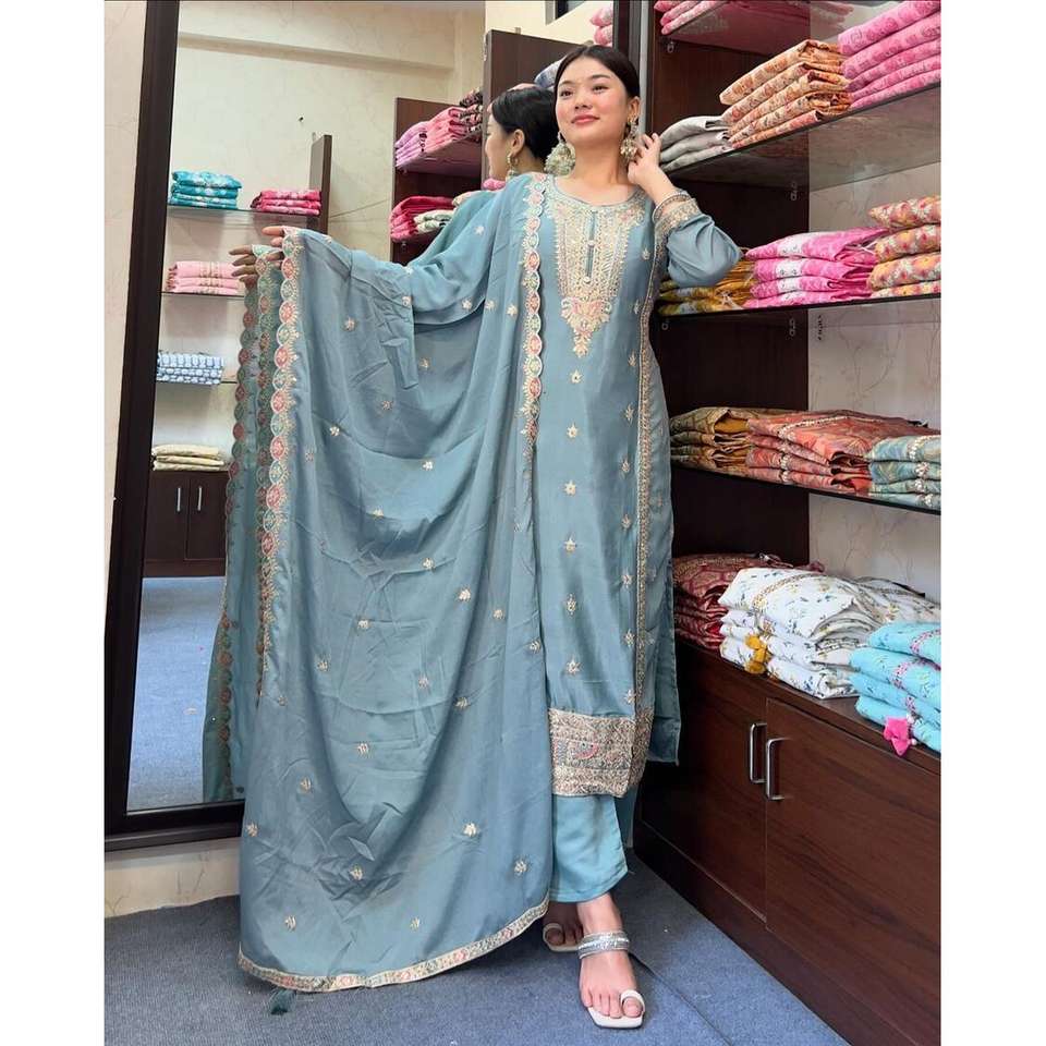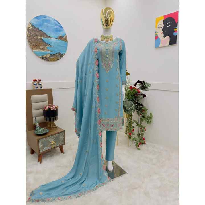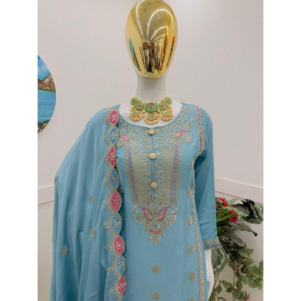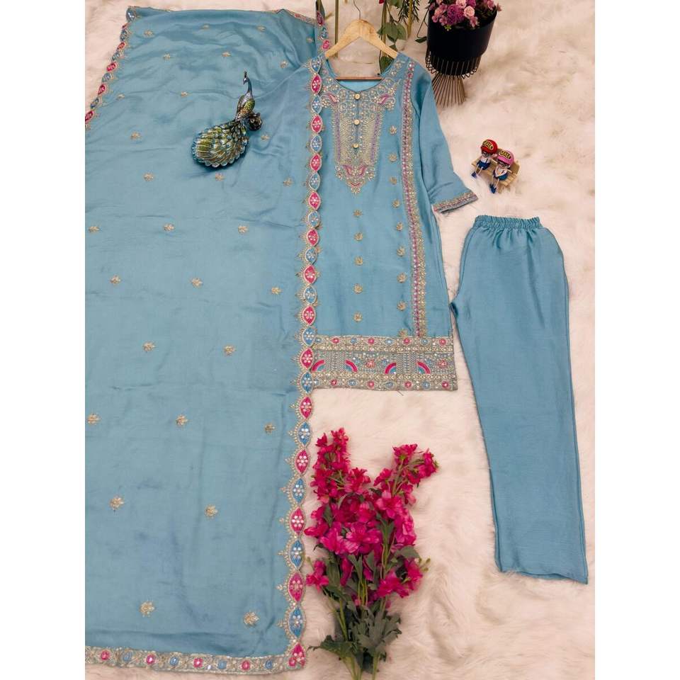 Fancy Chinon Silk Sequin Embroidery Work Top Bottom Set with Dupatta Sky