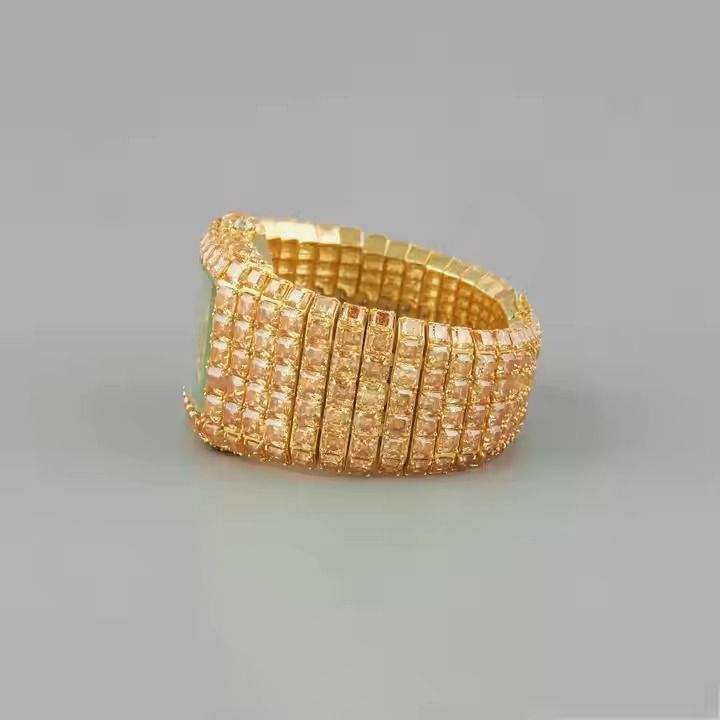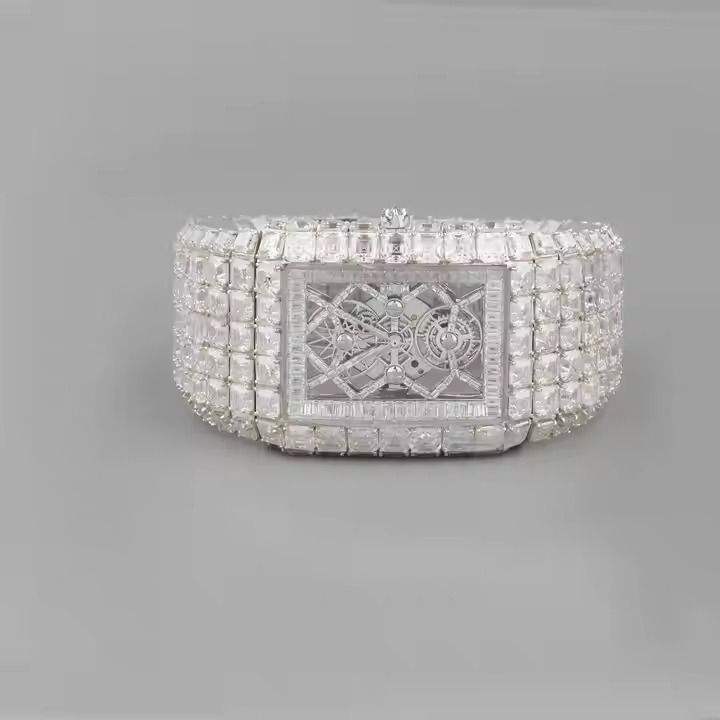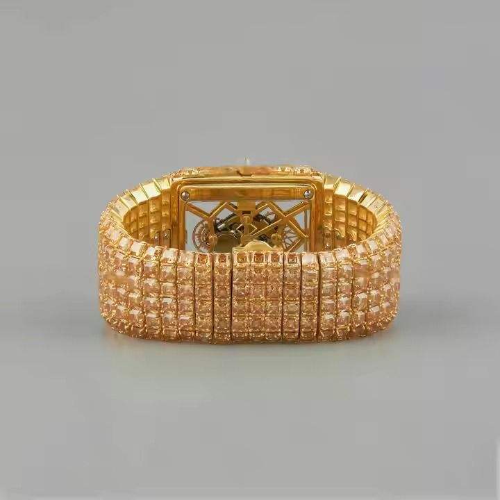 Fancy Intense Yellow Color Round Cut Moissanite Studded Rectangular Skeleton Dial Automatic Japan Movement Hip Hop Watch