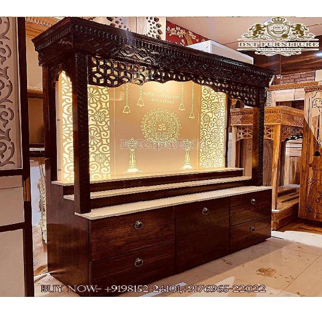 Fancy Laser Cut Traditional Teak Wood Home Mandir with Beautiful Marble Look Hand Carved Brown Pooja Temple