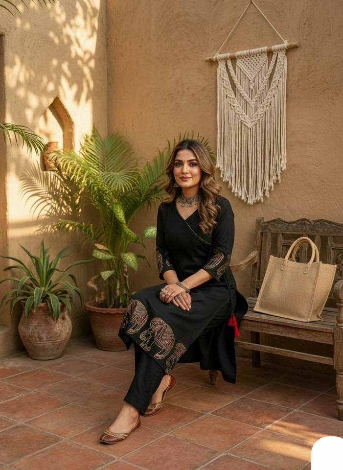 Heavy Premium Muslin Silk Fabric Black Color V Neck Style export-ready Kurti / Kurta for professional wear, cultural events,